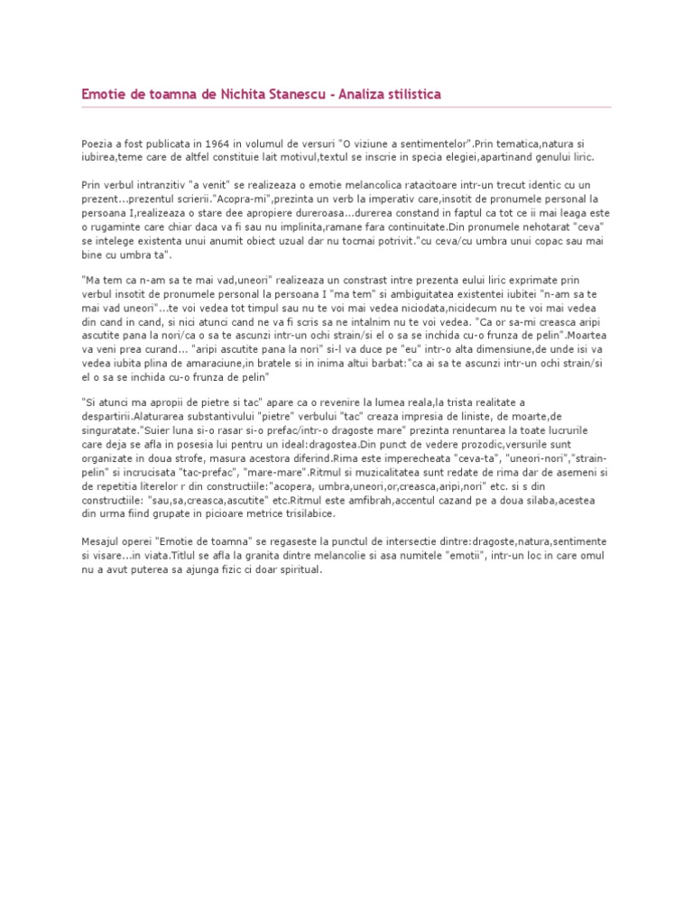 Dati Mi Va Rog Comentariul Poeziei Emotie De Toamnă De Nichita Stănescu Brainly Ro