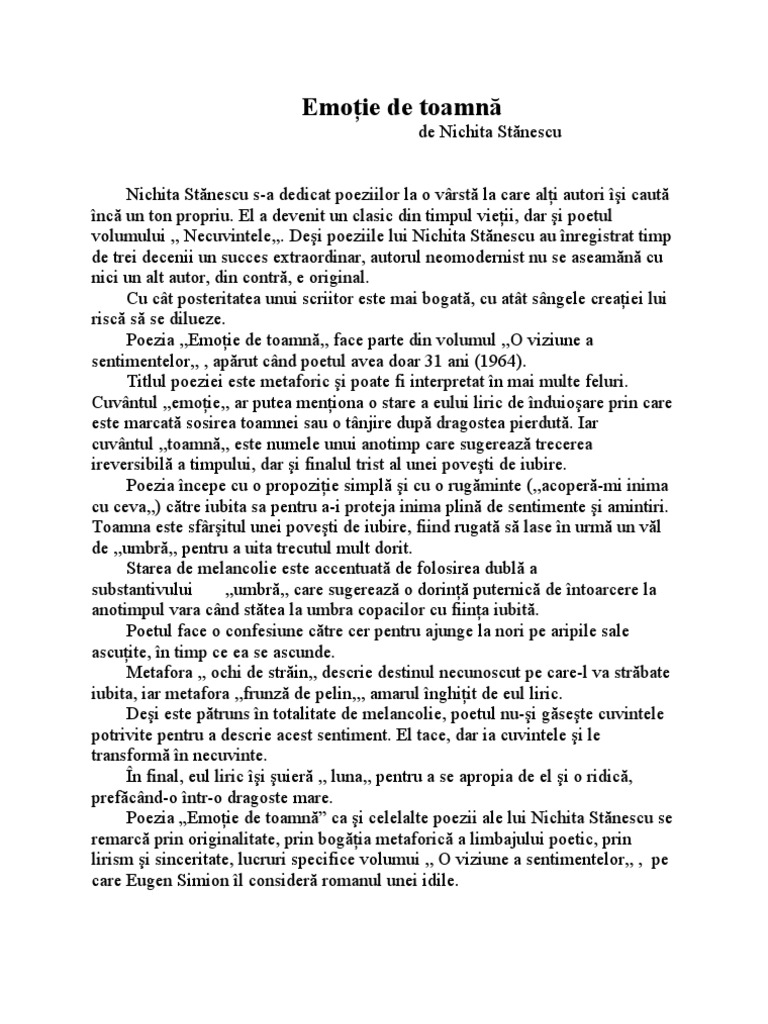 Comentariul Poeziei Emotii De Toamna De Nichita Stanescu